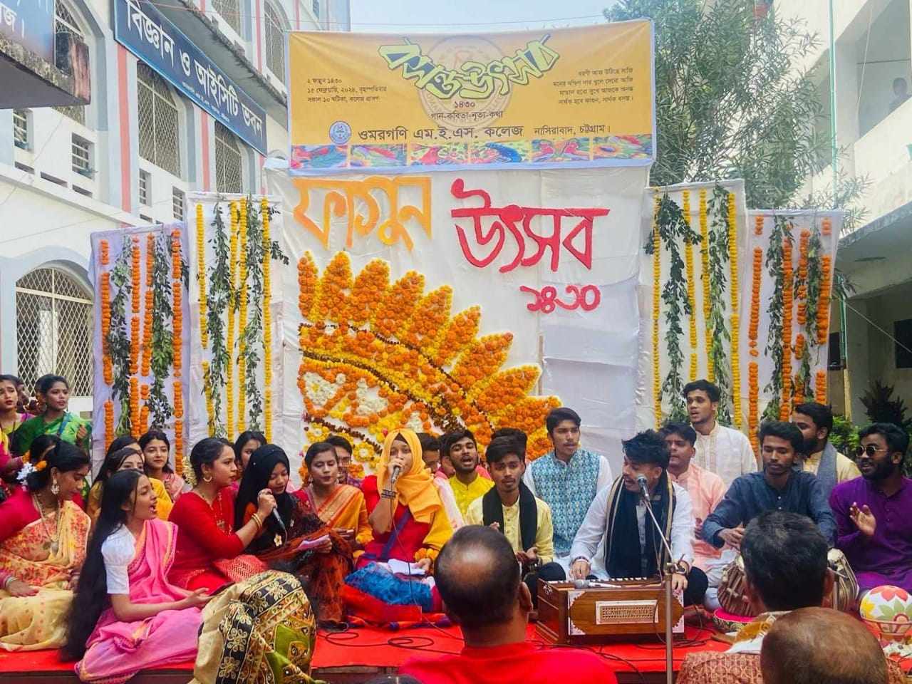 ওমর গণি এম.ই.এস. কলেজ প্রাঙ্গণে বর্ণাঢ্য আয়োজনের মধ্য দিয়ে গতকাল ১৫ ফেব্রুয়ারিঅনুষ্ঠিত হলো ফাগুন উৎসব। কলেজের অধ্যক্ষ আ.ন.ম. সরওয়ার আলম এর সভাপতিত্বে প্রধান অতিথি হিসেবে উপস্থিত ছিলেন কলেজের গভর্নিংবডির সম্মানিত সদস্য শিক্ষাবিদ,লেখক অধ্যক্ষ ড.আনোয়ারা আলম।বিশেষ অতিথি হিসেবে উপস্থিত ছিলেন উপাধ্যক্ষ রেজাউল করিম সিদ্দিকী,গভর্নিং বডির প্রতিষ্ঠাতা পরিবারের সদস্য মোহাম্মদ আলী।অধ্যাপক ববি বড়ুয়ার সঞ্চালনায় অনুষ্ঠানে বক্তব্য রাখেন কলেজ শিক্ষক সমিতির সাধারণ সম্পাদক অধ্যাপক নুরুল আমীন ,অধ্যাপক আয়েশা বেগম,অধ্যাপক শাহানা ইয়াসমিন , শিক্ষার্থীদের পক্ষে সাংস্কৃতিক অঙ্গনের সাধারন সম্পাদক ফাতেমা আক্তার।প্রধান অতিথি ড. আনোয়ারা আলম তাঁর বক্তব্যে বলেন , " সংস্কৃতি চর্চাই এক মাত্র মাধ্যম যার মাধ্যমে একটি দেশের কৃষ্টি সংস্কৃতি ঐতিহ্যের ধারাবাহিকতা রক্ষা হয়। পহেলা ফাগুন উৎসব আমাদের ষড়ঋতুর দেশের ঋতু বৈচিত্র্যের প্রজন্মের পরিচায়ক। আর বিশেষ করে শিক্ষাঙ্গনে এমন উৎসব শিক্ষার্থীদের সুস্থ সংস্কৃতির সঙ্গে পরিচয় করিয়ে সুন্দর প্রজন্ম তৈরিতে সহায়ক ভুমিকা রাখে। "সভাপতি অধ্যক্ষ আ ন ম সরওয়ার আলম তাঁর বক্তব্যে , "ঋতুরাজ বসন্তের প্রথম দিন। দেশের ছয় ঋতুর মধ্যে বসন্ত ঋতুরাজ। তরণ প্রজন্মের জন্য বলতে চাই- প্রকৃতি আমাদের আসল জায়গা। আমাদের যে অর্জন তার সবকিছুই প্রকৃতির কাছ থেকে। আসুন আমরা নিজেদের প্রকৃতির মধ্যে বিলিয়ে দিই।"দ্বিতীয় পর্বে কলেজের সাংস্কৃতিক সংগঠন ওমরগণি এম.ই.এস. কলেজ সাংস্কৃতিক অঙ্গনের সভাপতি শেখ মোঃ শরীফুল আলম সৌরভ এর সঞ্চালনায় অধ্যাপক নন্দিতা বড়ুয়ার তত্বাবধানে সংগঠনের সদস্যদের পরিবেশনায় অনুষ্ঠিত হয় মনোমুগ্ধকর সাংস্কৃতিক অনুষ্ঠান। সঞ্চালক শেখ সৌরভের রোমাঞ্চকর কথার ছন্দে, সংগঠনের সংগীত শিল্পী জয়, মাহফুজ, তিলক ও তাদের দলের গানে গানে, শ্রাবণ্য, ফারহানা, শারমিন, বর্ষা, আতকিয়া, স্মৃতিদের নৃত্যের তালে, ফাতেমা ও তার যন্ত্রীরাদের আবৃত্তি ভাব-বিনিময়ে শিল্পীরা উৎসবকে মাতিয়ে তোলেন। এ ছাড়াও অনুষ্ঠানকে চমকপ্রদ করে তুলতে ইসরাত, তামিম, হাবিব, জিন্নাত, শ্রাবণ্য, শর্মিলা, মাহফুজ, জয়, তিলক জয়ন্ত, বর্ষা, শারমিন, সালেহ্, ফয়সাল, জিসান, আতকিয়া, আজিজ, ইমরান, ফারজানা, ফারহানা, নজরুল,স্মৃতি, অর্পা, রিফাত,আরাফাত, সাফরিন, রিনভি,সাইফা, সাইবা, ইমন, অরিত্রী, সাজন, ফাহমিদা, স্বপ্নীল, মুনজারিন, সাগর, ফাহাদ, দীপা, মুগ্ধ, হাসান, রূপা, খুশবু, নুসরাত মিম সহ প্রমুখ দলীয় পরিবেশনা সহ বিভিন্ন সাজসজ্জার কাজ করেছেন, সাউন্ড সিস্টেম পরিচারনায় ছিলেন রিফাত সাইফুল্লাহ্ ও ছবি তুলেছেন ইফতেখার তুহিন।নারীদের পরনে ছিল হলুদ শাড়ি। খোঁপায় ছিল গোলাপ ও গাঁদা ফুলের মালা